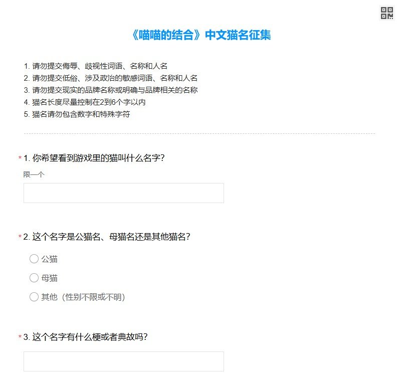 他随文附上了问卷链接,并提醒参与者注意填写须知。通过筛选的优秀猫名,将在《喵喵的结合》简体中文版本中随机赋予游戏中的猫咪角色。Tyler Glaiel随后补充说明,该活动目前仅针对简体中文本地化,其他语言版本的类似调研将在未来陆续推出。