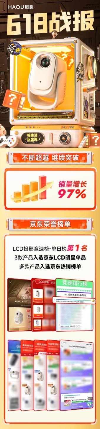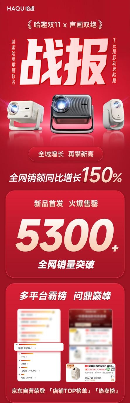 回望2025年,哈趣用一组组亮眼数据,书写了属于自己的增长故事:618期间销量同比增长97%,拿下京东LCD投影竞速榜单日榜第1名;双11全网销额同比暴涨150%,新品首发销量突破5300 + 台,多平台霸榜,成为投影市场最具活力的“黑马”。