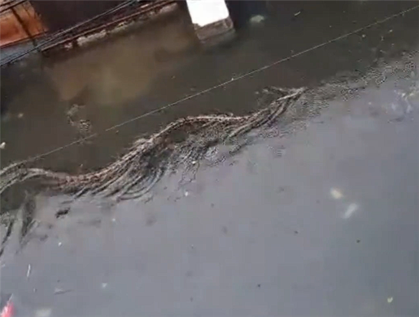 一条将近5米长的网纹蟒在暴雨后的居民区积水中游过
