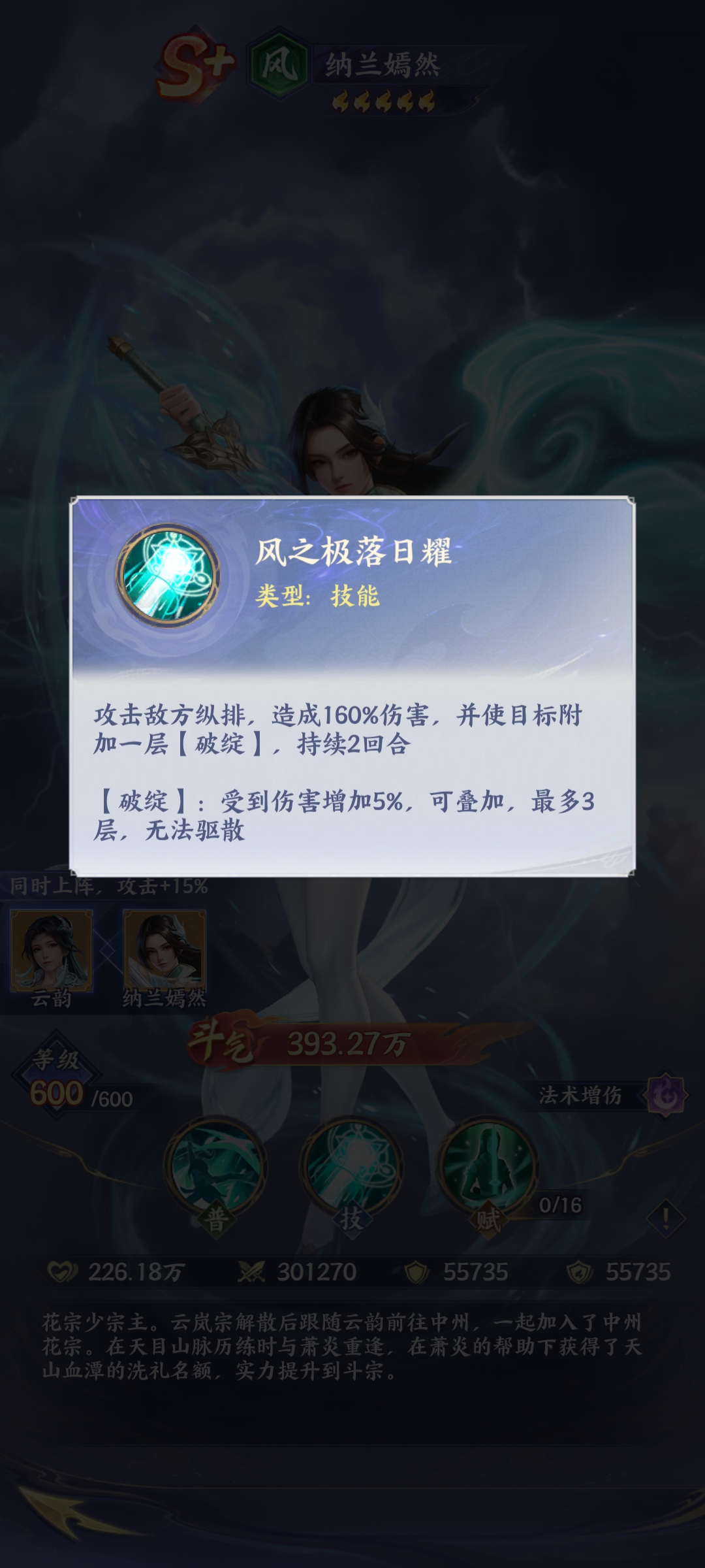 其实纳兰嫣然是非常值得培养的,而他作为S加级别的斗者,在整个团队当中,他能够有效地形成增伤。在战斗的过程当中,它其实能够给敌人施加破绽的效果,毕竟她的普通攻击技能能够实现单体攻击,而在战斗的过程当中,他也能够有效的施展核心技能,那就是风之极落日耀。在这样的情况下,他能够直接攻击敌人的重排,从而给敌人造成高额的伤害,还能够为目标附加一层破绽。并且这种状态可以持续两个回合。