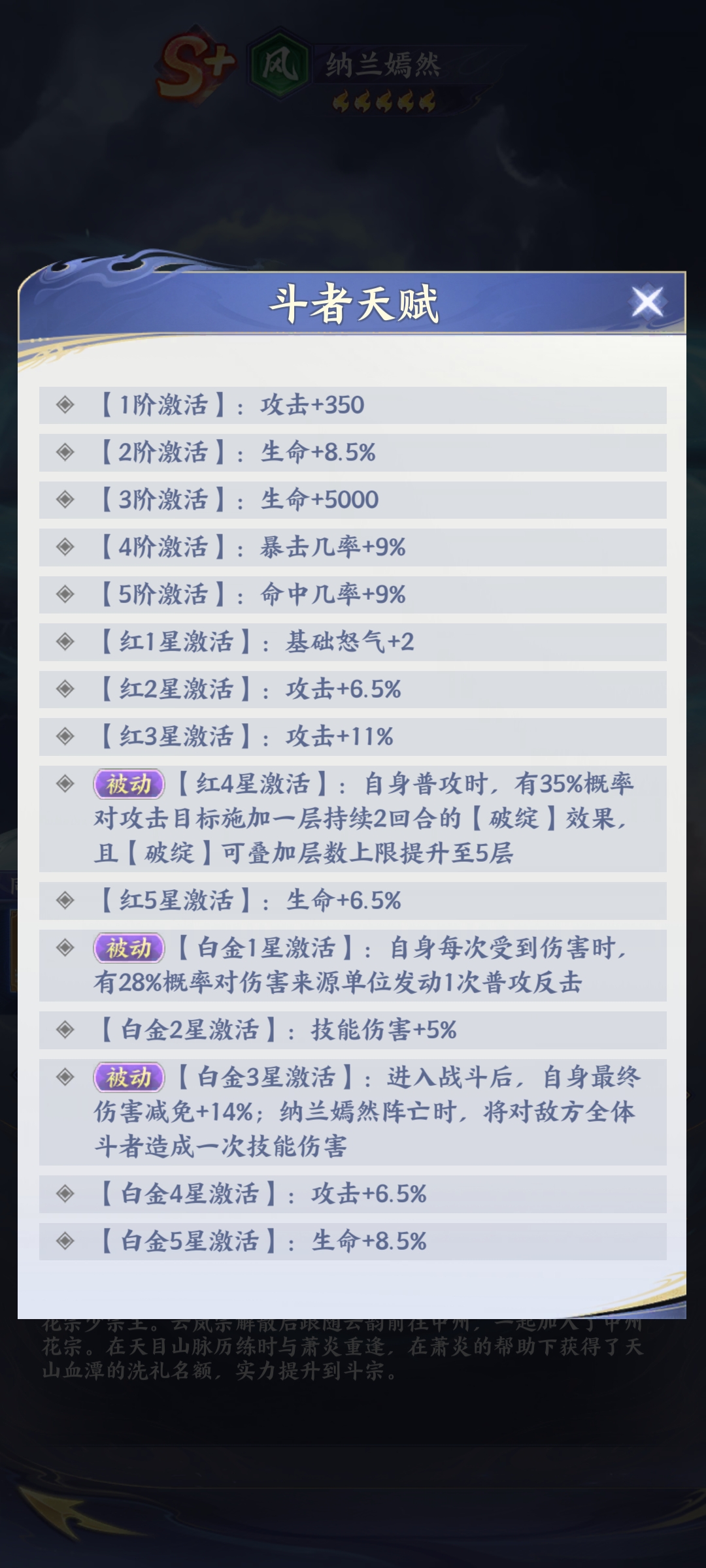 纳兰嫣然的天赋设计的比较全面,比如它具备输出效果,当然也能够满足生存条件。对于玩家来说,在整体的战斗过程当中,他其实是比较强大的输出,因为它能够拥有攻击生命等等基础属性的加成,一旦拥有了这些之后,他其实能够稳步的提升战斗力。