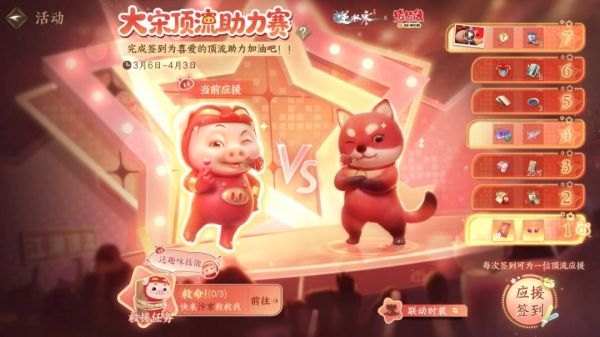 3 月 6 日,猪猪侠联动正式开启,玩家参与【大宋顶流助力赛】活动,就能为血河小狗和猪猪侠应援助力,获得联动奖励。