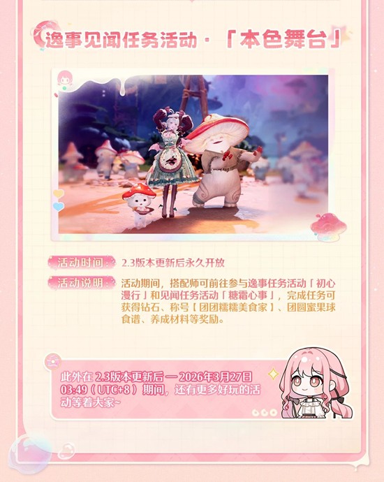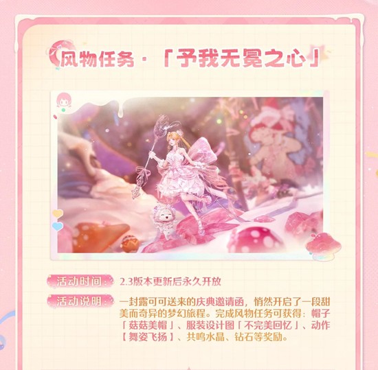 一封露可可送来的庆典邀请函,悄然开启了一段甜美而奇异的梦幻旅程。完成风物任务可获得:帽子「菇菇美帽」、服装设计图「不完美回忆」、动作【舞姿飞扬】、共鸣水晶、钻石等奖励。