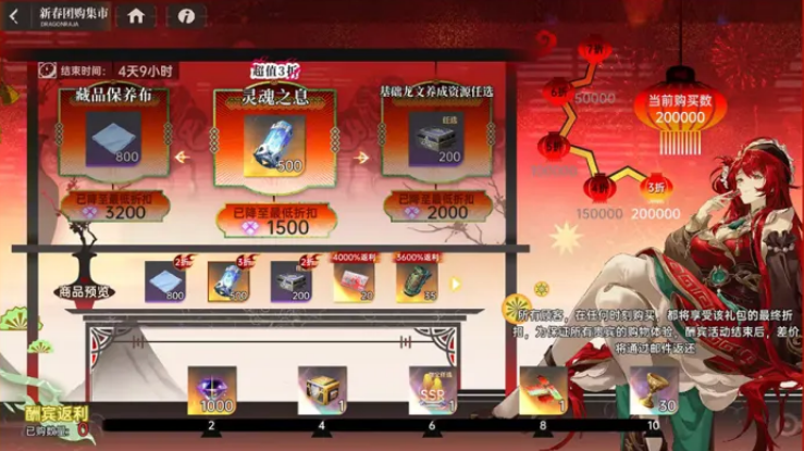 团购这边分两期,第一期是2月11日到18日,第二期是2月18日到2月24日。团购礼包的折扣会,随着购买人数增加而变大,也就是买的人越多越便宜。有一个点值得注意,就算你提前买了,到活动结束的时候,如果折扣变低了,差价会返还给你,不用担心买亏了,可以在合适的时候入手。