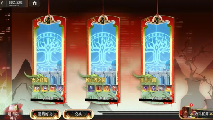 「回忆之旅」这个板块需要完成指定任务,或者邀请已经弃坑的好友回来重新玩,完成后能拿到随机插画,把插画收集够了可以换一些稀有奖励,限定招募券、UR招募券、剑灵之吻、超限觉醒石还有限定名片「熙春嘉岁」都在里面,想拉老朋友回坑的专员,可以借这个机会,双方都有好处。