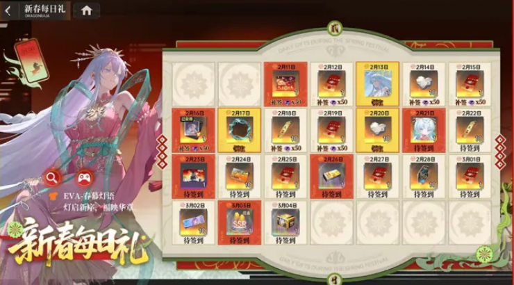 每日登录的板块叫「新春每日礼」,活动期间每天进游戏就能领东西,限定伙伴EVA、皮肤「EVA-春幕灯语」、头像框「龙鳞祈岁」还有EVA头像,这些都是登录直接给的,活动期间还有神秘伙伴来电的彩蛋,具体是谁先不透露,专员们自己登录看。