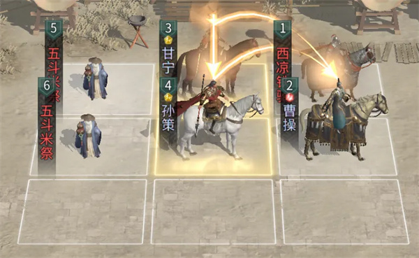 兵种站位:在曹操的上方放置一个西凉铁骑,在甘宁和孙策身后各放置一个五斗米祭。