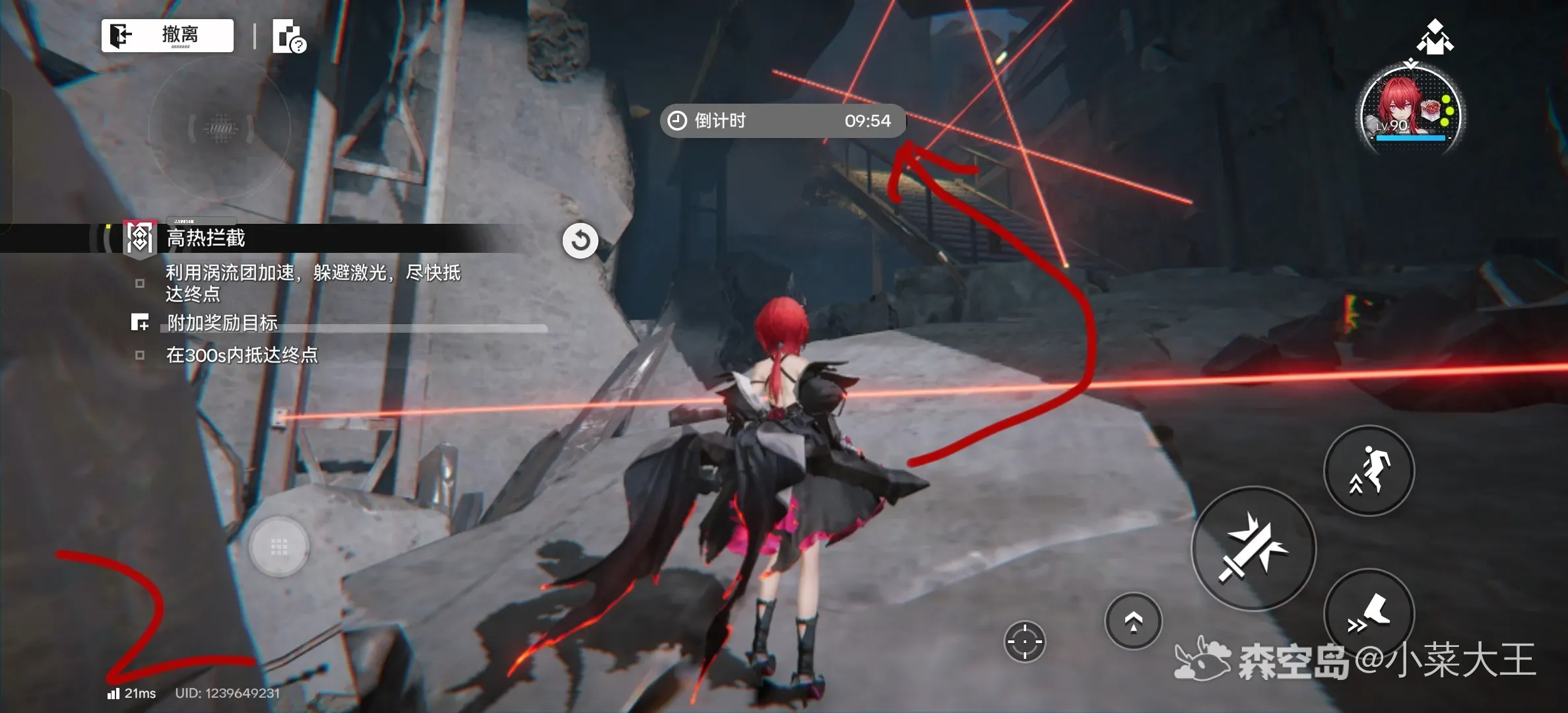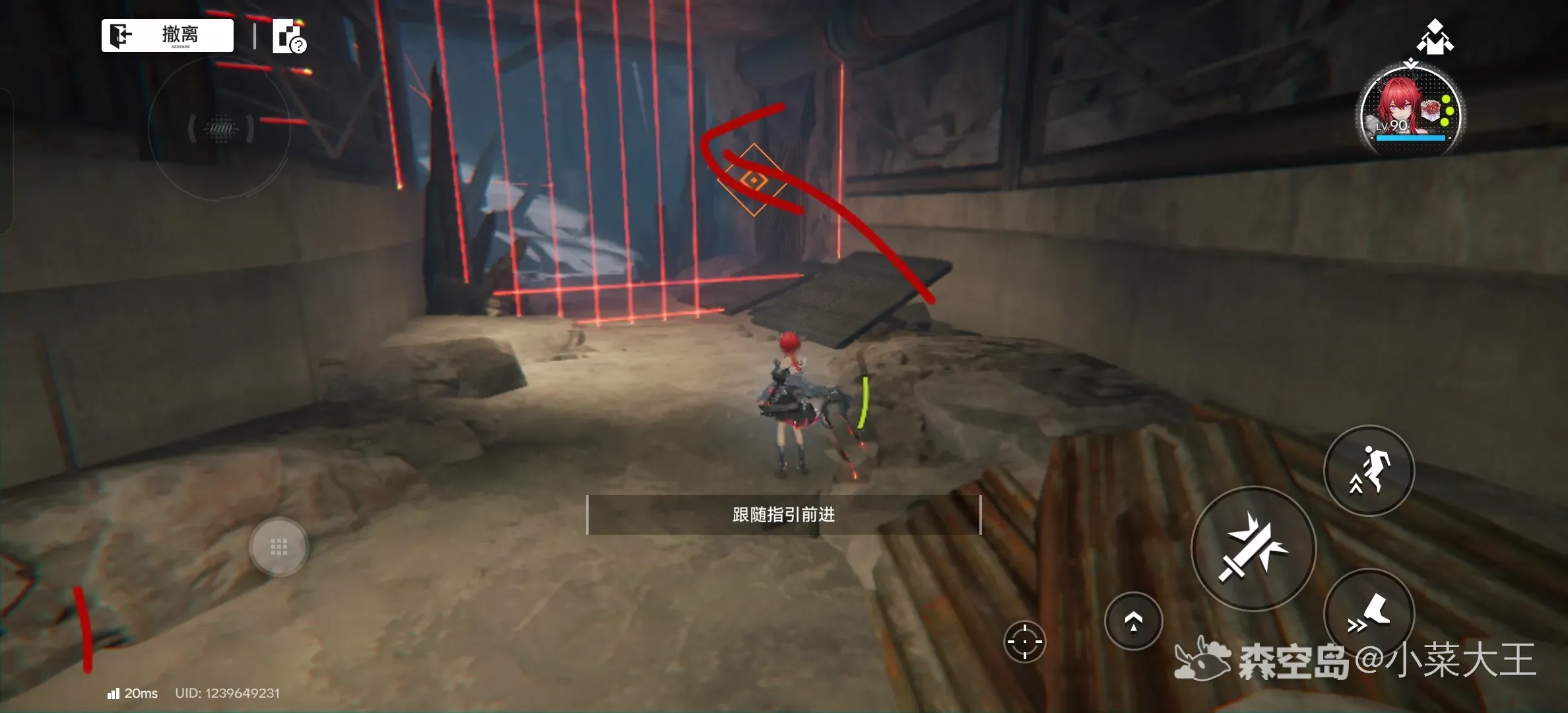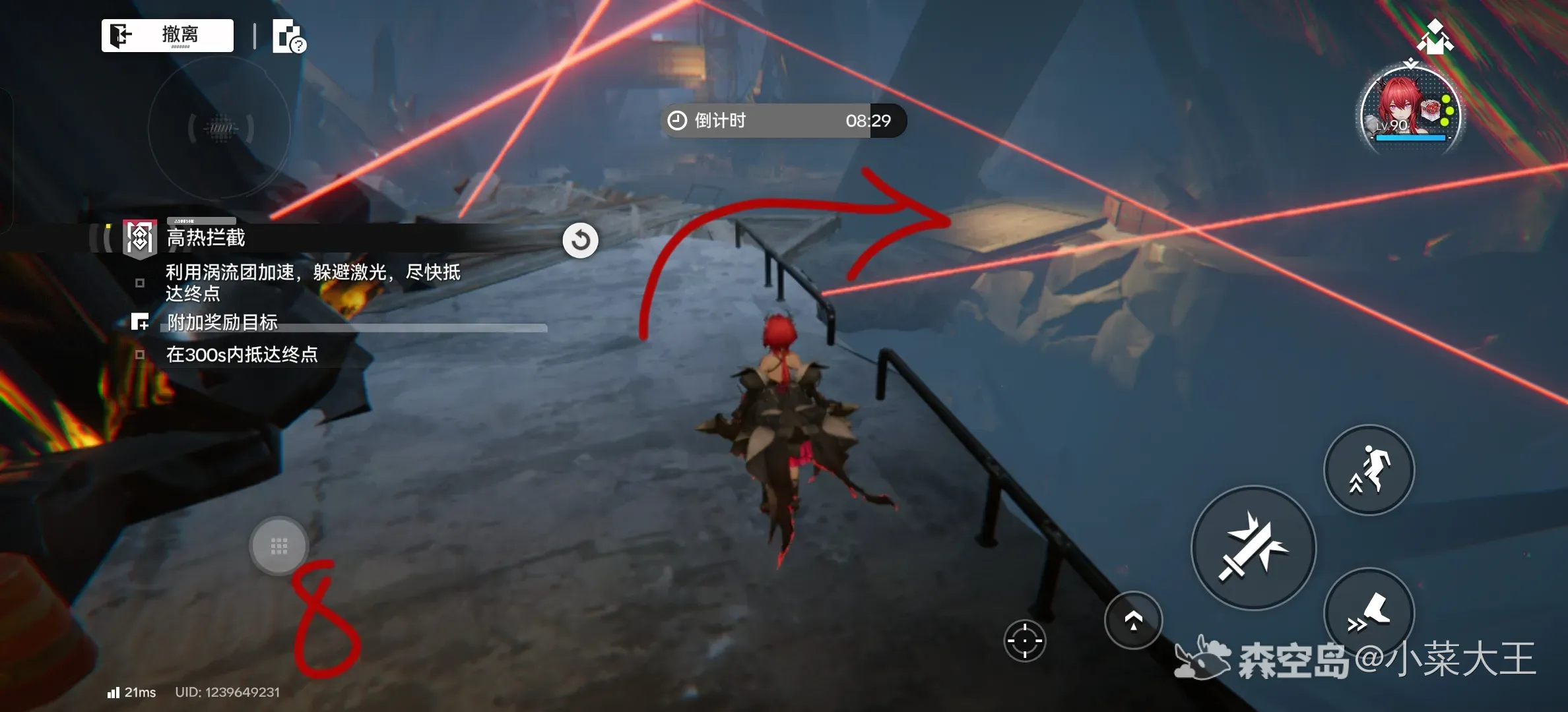 1.大洞下去后开启激光阵,向左走有台阶,把图中按钮全关掉以后就可以过去了(最后一个冲刺跳跃能过去)