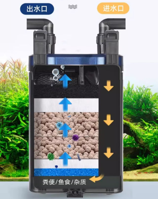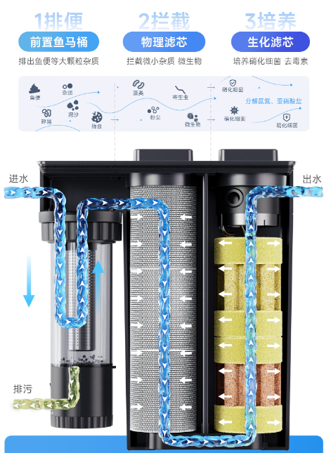 安彩采用的是传统的沉积过滤。水流进入桶身后,依靠重力自然下渗或简单导流。这种模式下,水流极易产生“短路现象”——即水流会选择阻力最小的路径通过,导致部分滤材长期处于死水区,无法发挥效能。且排泄物直接堆积在滤棉底层,长期浸泡在循环水中,成了不断释放氨氮的“污染源”。