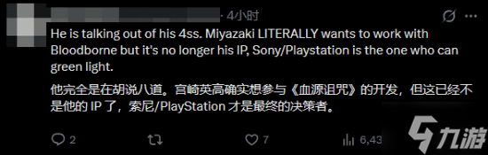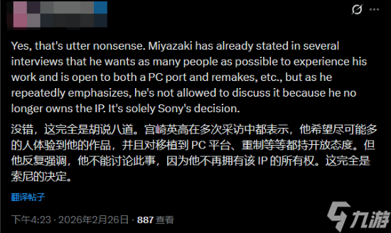 但绝大多数玩家认为这一理论站不住脚,因为现如今《血源》的版权握在索尼手中,此事绝非宫崎英高一人说了算的,即便索尼尊重宫崎英高的意愿,此事也可通过沟通解决。