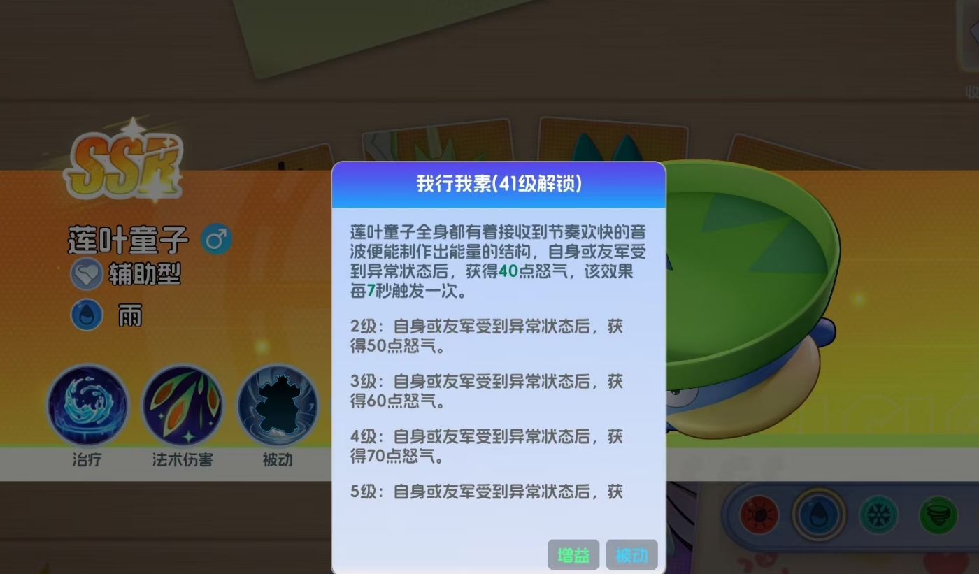 当莲叶童子等级达到41级,将激活被动技能“我行我素”,该效果可在自身或任意队友触发异常状态时,立即恢复一定怒气值。虽然存在7秒冷却时间,但配合技能等级提升后,怒气回复频率明显高于常规辅助,常出现敌方仅释放1次大招而莲叶童子已完成2次大招循环的情况。这种怒气优势直接转化为更高的负面清除覆盖率与治疗频次,强化其作为功能型核心的不可替代性。另一项技能则专注提升基础生存能力,通过增加最大生命值与防御数值,确保其在前排承伤或中排站位时具备足够容错空间。