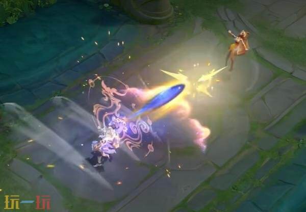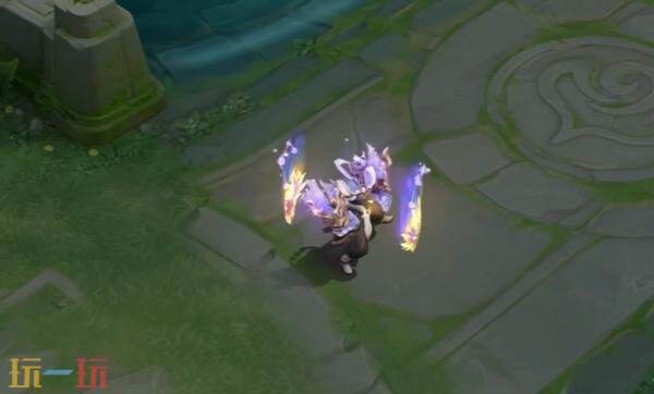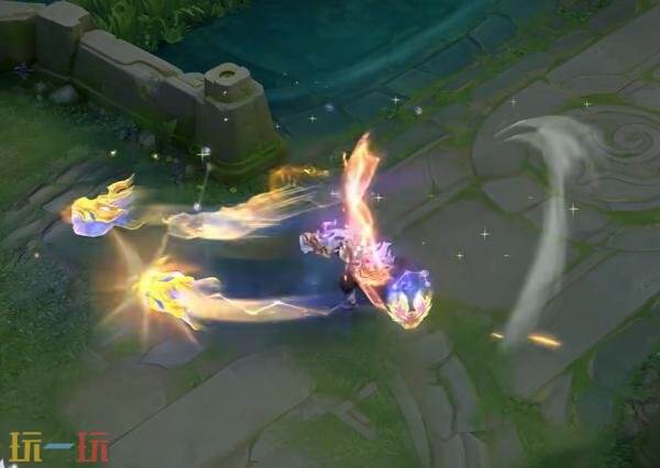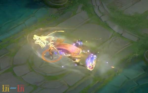 被动:以亢金龙龙头剪影为基底,融合璀璨的星宿图案,细碎星尘粒子环绕旋转,构筑出一个环绕周身的星辰护盾。强化普攻将金色龙头向前轰出,势如奔雷,直破云霄。
