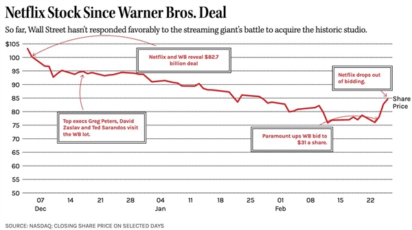 之前网飞曾与华纳达成意向,以827亿美元收购华纳影业与HBO。派拉蒙的方案为整体收购,包括华纳-探索的CNN、TNT等有线业务,旧方案为每股30美元,收购金额1080亿美元;若按新方案计算,则总价来到1110亿美元。