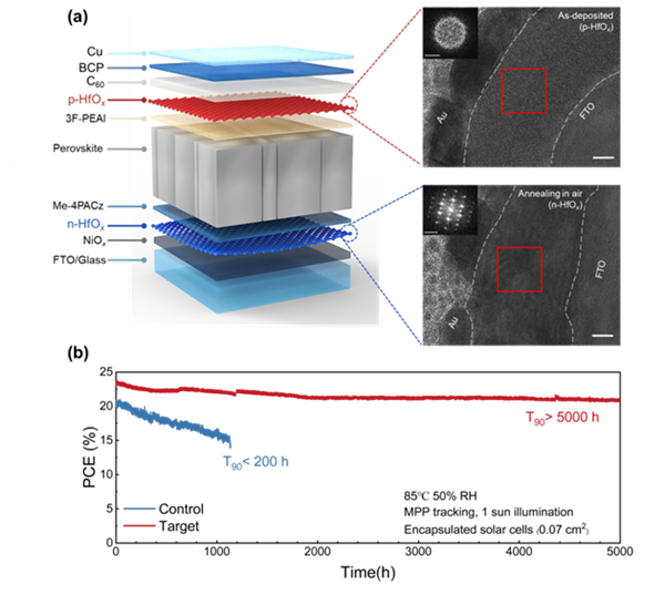 引入可调控的氧化铪中间层,分别在空穴和电子传输层构建稳定的键合结构,从原子尺度同步解决界面稳定性问题。