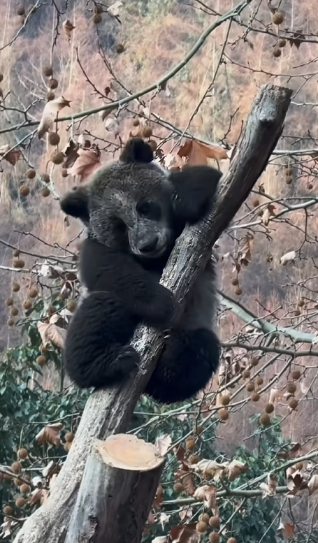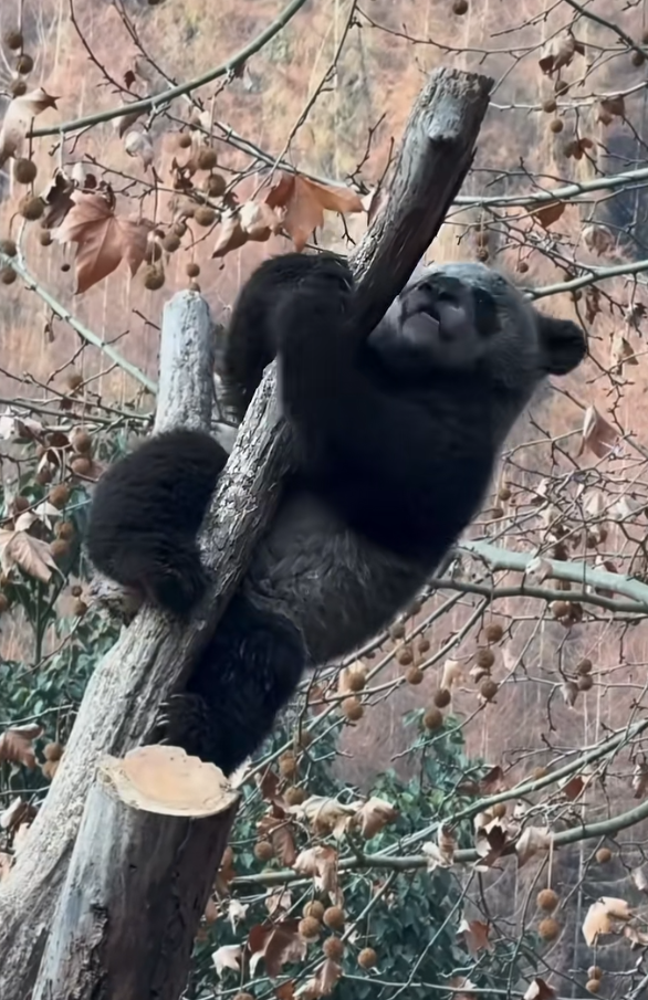 苏锦崽趴在树枝上,原本应当黑白分明的毛色几乎“黑成一片”,连脸部的白色区域也被染得发暗。