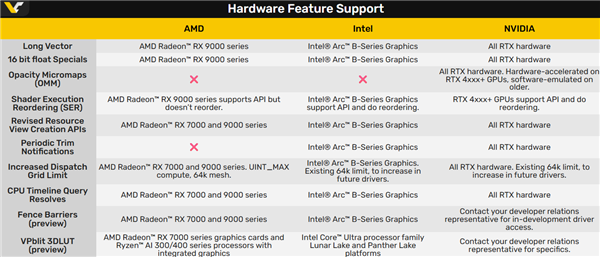 SER则是NVIDIA RTX 50/40系列、Intel Arc B系列硬件支持,AMD RX 9000系列只是支持API,但实际上没有重排序。