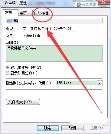 5、收件箱属性窗口中,选择自动存档选项卡。