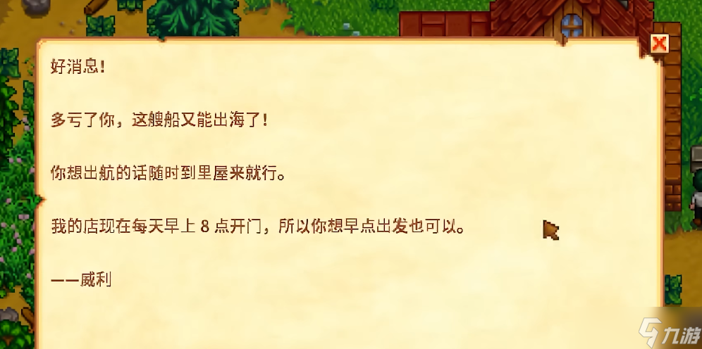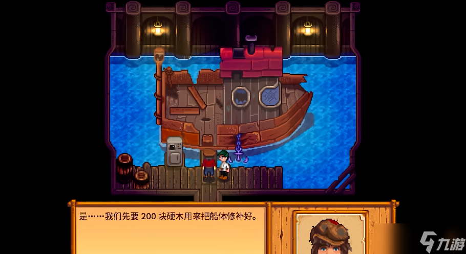 收到信件后,前往位于沙滩的威利鱼店。你会发现威利身后平时关闭的一扇门现在可以进入了,穿过这扇门来到后院,会看到一艘破旧的船只。威利会请求你帮忙修复它,修复工作需要三种关键材料:两百个硬木用于修复船体,五个电池组用于修复售票机,以及五个铱锭用于修复船锚。硬木可以通过升级后的斧头砍伐大地图上的大木桩获得;电池组主要通过避雷针在雷雨天气收集;铱锭则需要在熔炉中用铱矿石冶炼而成。将这些材料交付以完成修复后,第二天起你就可以在售票机处花费一千金币购买船票,乘船前往姜岛了。