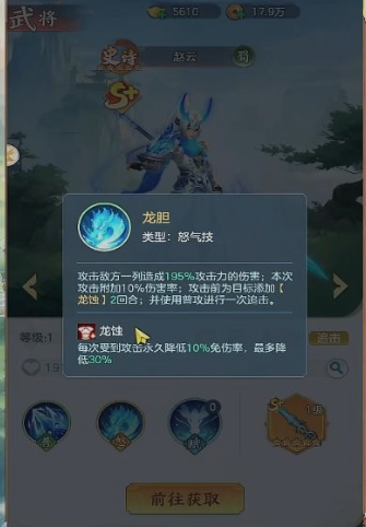 赵云的实战能力真的是无话可说,怒气技能龙胆,一旦在打到敌方之后,就会造成195%的攻击力伤害,并且还会额外增加10%的伤害率。打完之后还会追加普通攻击,不管是单点压制还是持续性的输出,都是比较有优势性的。在游戏里面还会定向送进阶素材,培养门槛就会直接拉低。前中期靠他就能有机会迅速的站稳脚跟,在同阶段的玩家中可以迅速的打败其他的对手。