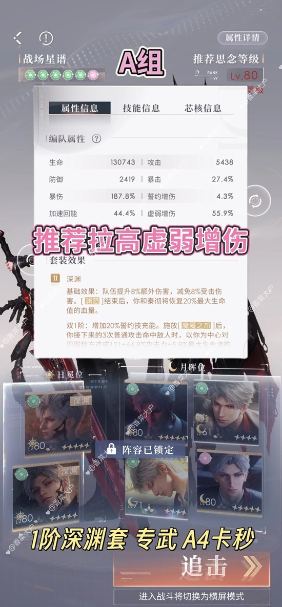 A组:【空间波动】是恢复生命后提高我方伤害,适合秦彻深渊套。建议走虚弱流。