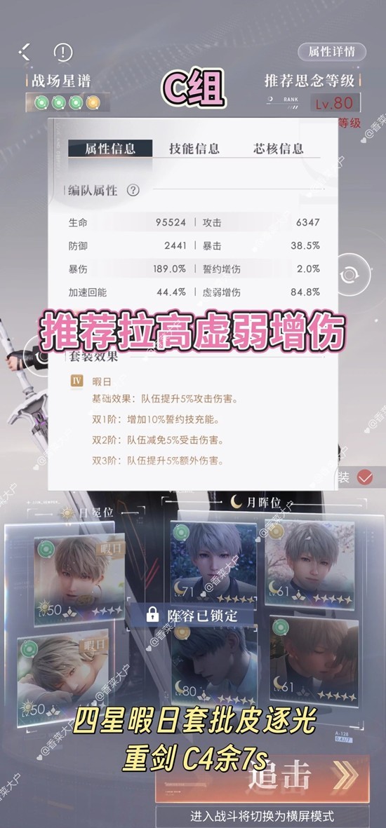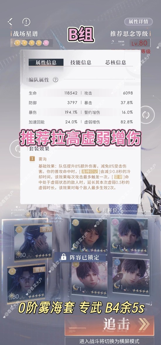 B组:【空间波动】是提高主动技伤害,且释放主动技后3秒内,提高重击伤害。用祁煜雾海套或沈星回光猎套均可。建议走虚弱流。