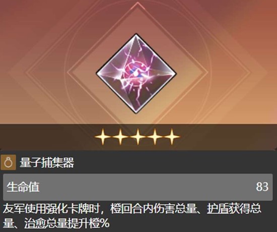 当量子收集器升至满星状态时,将激活一个强大的团队增益效果:在己方任意成员使用强化卡牌的回合内,全队造成的伤害、提供的护盾以及治疗量都会获得一定百分比的额外提升。这个效果使得它在各种队伍配置和战斗场景中都能发挥巨大作用,无论玩家使用的是输出、坦克还是辅助角色,量子收集器都能提供可观的支援。