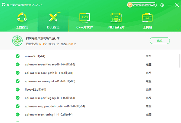 这时候与其一个个手动下载,不如整体修复。对于新手用户,可以使用“星空运行库修复大师”这类工具,一键扫描系统运行库环境,自动检测缺失或异常组件并完成修复。操作步骤: