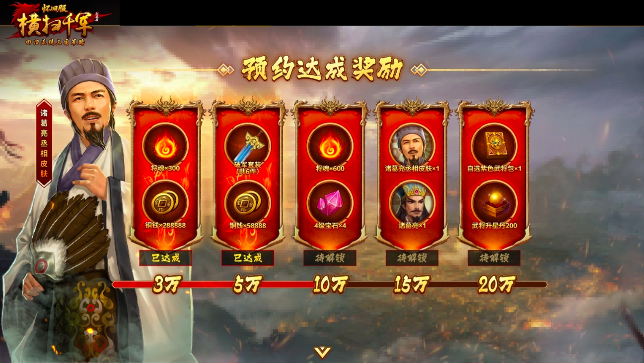 预约阶段同步开启阶梯式回馈计划:预约人数达3万,全服发放300将魂、288888铜钱;突破5万门槛,追加破军6件套与58888铜钱;预约量达10万时,解锁600将魂及4枚4级宝石;达成15万预约,诸葛亮英雄角色+丞相皮肤同步到账;当预约总数跃升至20万,每位参与预约的玩家均可领取自选紫色武将礼包×1、武将升星丹×200。奖池持续滚动叠加,未预约玩家仍可于公测后通过活动补领部分基础奖励。