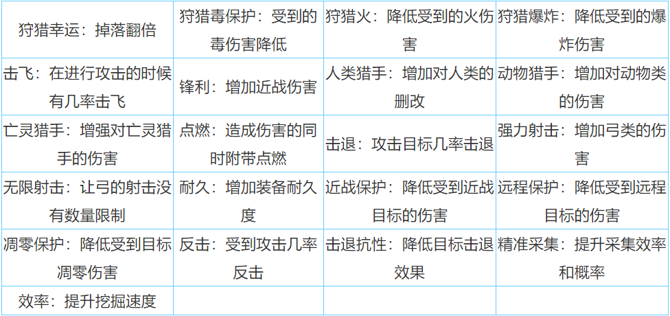 刀剑矛可选择附魔:锐利、耐久、猎手、击飞、击退、点燃、狩猎幸运