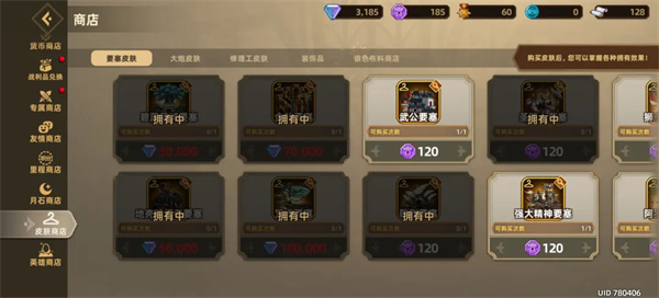 要塞皮肤:合成金色大炮或者维修工可以解锁每个阶段的钻石要塞皮肤加成,要塞皮肤加成是独立乘区,别看就加几百,这个可是乘算,不是加算,加成很高必须买。