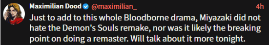 然而现在,剧情看起来有了反转,爆料人Maximillian Dood补充称,宫崎英高并非因讨厌《恶魔之魂》重制版而拒绝《血源诅咒》重制,并表示他将进一步详述细节。