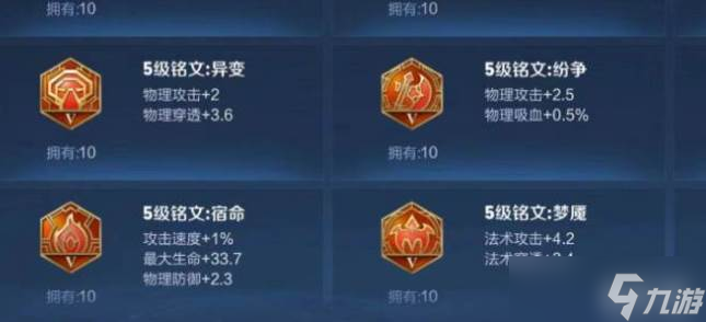 另一套搭配是攻速暴击流,由10鹰眼、10狩猎、7无双和3祸源组成。这套铭文兼顾了攻速、移速、暴击率和暴击效果,10狩猎提供的10%攻速和10%移速,能让敖隐的走A手感更加流畅。7无双和3祸源的组合,既保证了前期有一定的暴击频率,又能在后期配合无尽战刃将暴击拉满。攻速暴击流更适合操作玩家,移速加成让敖隐在支援和追击时更加灵活。攻速的提升也能让他更快地打出强化普攻,触发龙魂印记的效果。在后期团战中,高暴击效果配合破晓的物理穿透,即使面对坦克英雄也能快速压低血量。不过这套铭文需要搭配泣血之刃来补充续航,成型速度相对较慢。