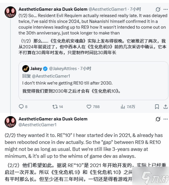 针对玩家关心的《生化危机 10》(RE10),AestheticGamer 表示,该作早在 2021 年就已启动开发,但在开发过程中已经重启过一次。这意味着 RE9 与 RE10 之间的间隔可能不会像以往系列作品那样漫长。不过,他同时指出,RE10 至少还需要三年时间才能与玩家见面,具体发售时间仍取决于开发团队的进度。