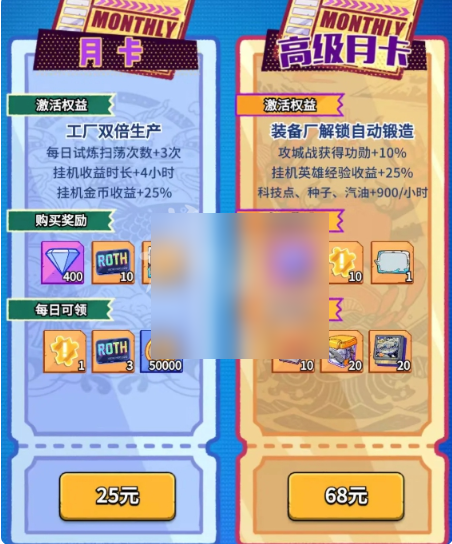 3、普通月卡权益(25元):每日试炼扫荡次数+3就很夸张了,要知道VIP11的扫荡次数也只能+2,有三个试炼副本,就是每日多9次扫荡;前中期金币一直是极其稀缺,所以月卡挂机金币收益+25%和每日可领的5w金币都很有必要,挂机收益时长+4小时和累计100张招募卡,虽然与前面的比起来显得无足轻重了,却更彰显了月卡T0性价比的地位,最重要是开启第二生产位同时生产(极大提升生产效率)。