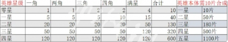英雄星级对应碎片消耗