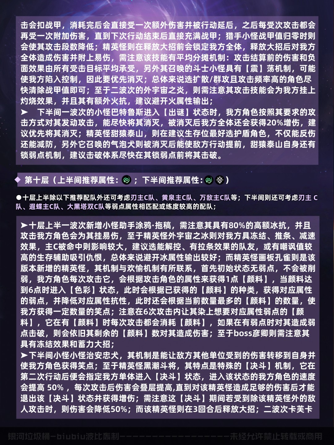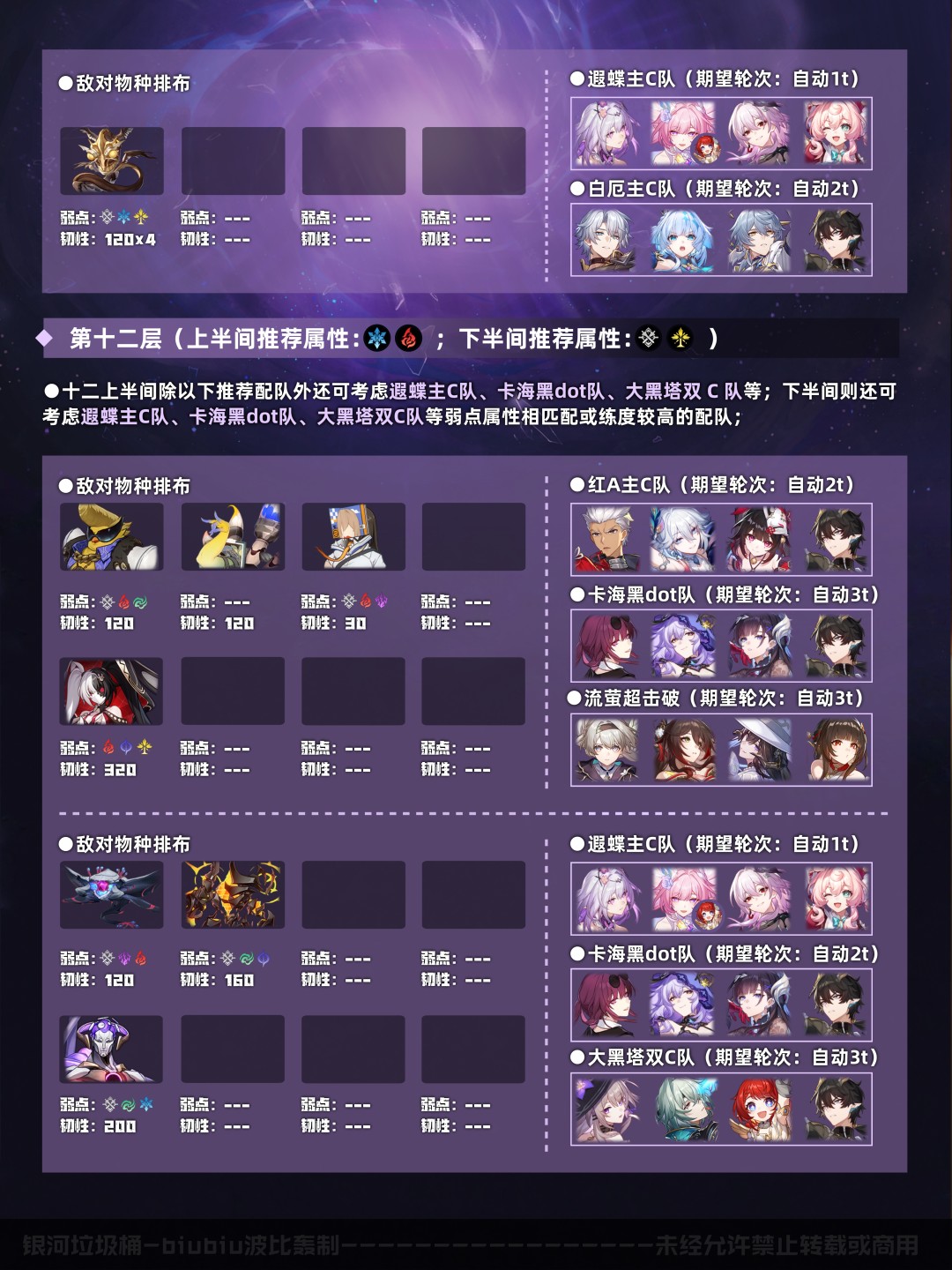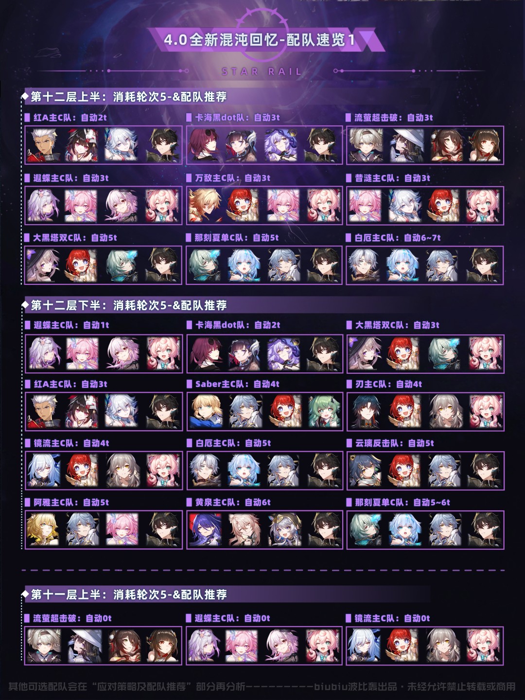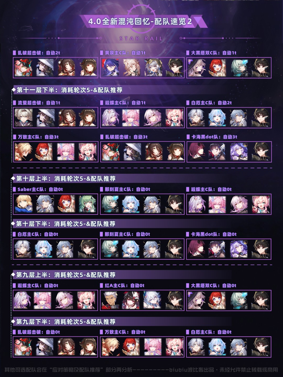 以上是本期的配队推荐速览(五星0+0/1,四星4~6魂,中低练度<遗器主词条正确,副词条>),想尽快了解可进行参考;下面就让我们对本期混沌回忆进行更详细的分析吧;