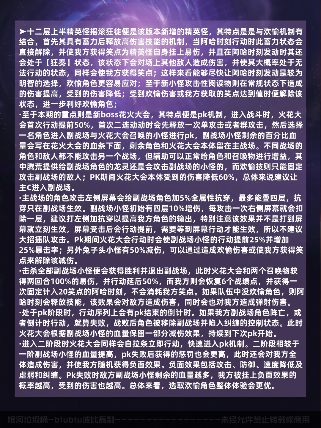 本期混沌回忆综合难度适中,敌对物种上需注意该版本新加入混沌回忆的boss火花大会;该版本新增的敌人大多均与新的欢愉机制挂钩,因此欢愉命途的角色应对起来会有更好的体验;至于本期的混沌buff则与笑点挂钩,笑点依旧是欢愉角色的特有机制,欢愉角色很容易就能叠满buff;可以让往常的常规配队中的一名角色替换为爻光来触发该机制,下面的配队速览部分就不再替换了;