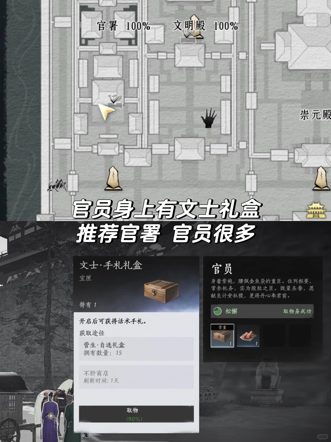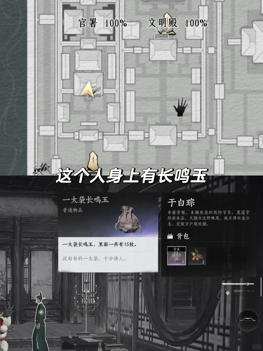 大内卫士是身上披着红披风的禁中内侍是在宫殿内干活的 在大树边常见 红袍和紫袍官员身上有好东西 官署的绿袍官员也有面条buff叠加十次就可以解锁金成就