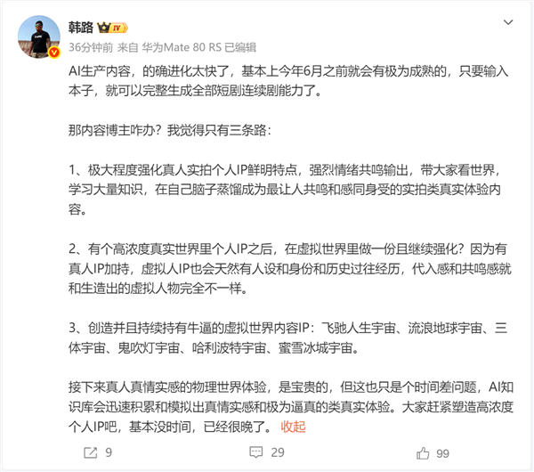 AI生产内容进化太快了!大V韩路:内容博主只有这三条路