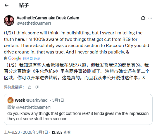 爆料人AestheticGamer在X平台上透露:"肯定有人觉得我在胡说八道,但我发誓所言非虚。我100%确定《生化危机9》确实删减了两部分内容。原本确实存在第二个可驾驶探索的浣熊市区域,这个情报是真实的。我此前从未公开说过这些。"