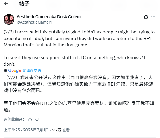 他在后续帖子中补充道:"我从未公开提过这点(庆幸没说,否则现在可能已被追杀),但我掌握的情况是,开发团队确实制作了初代洋馆的回归场景,只是最终版本中没有收录。"对于被删减内容是否会以DLC形式回归,他表示:"至于这些废案会不会用在DLC里?天晓得,反正我不知道。"