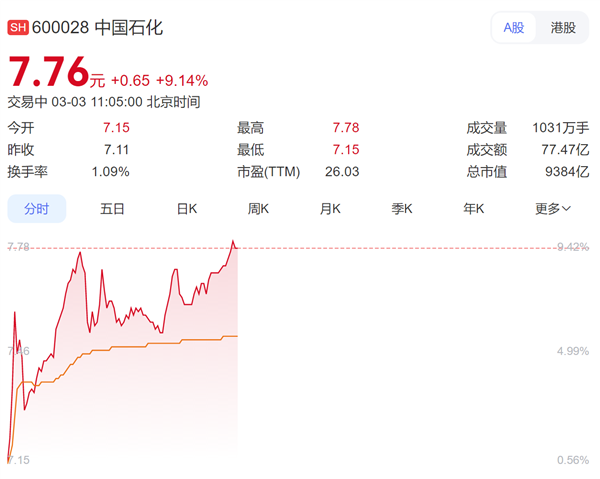 中国石油同样表现亮眼,股价续创11年来的新高,其A+H股总市值已超过2.3万亿元。与此同时,中国石化的涨幅也维持在9%以上,三大石油巨头展现出强大的市场号召力。