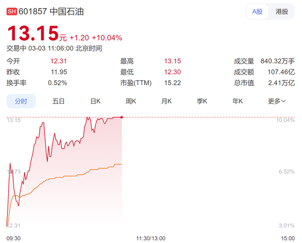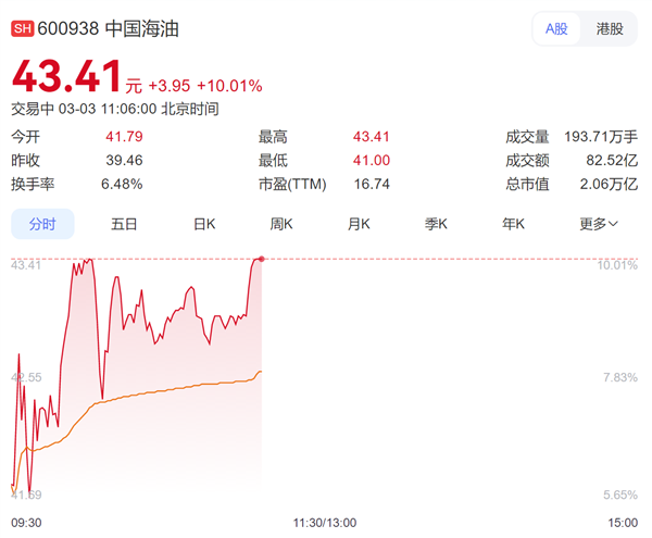 受国际局势和油价走强的强势推动,今日A股相关受益个股及整个石油板块再度迎来爆发。中国海油与中国石油两大巨头在盘中双双涨停,表现极为强劲。