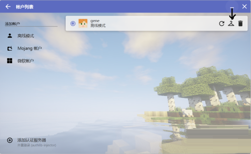第一步:打开HMCL启动器并注册离线帐户,并进入“帐户”面板。点击帐户栏上的小衣架按钮(请注意你的HMCL是否为最新版本,因为部分版本没有这个按钮)。