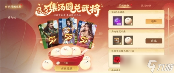 收集汤圆,即可在武将池中自选一位武将兑换(8 选1:王悦、王桃、穆顺、秦宜禄、吕旷吕翔、冯熙、李婉、尹夫人)。主公可任选心仪武将,助你横扫千军、称霸沙场!