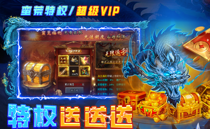 游戏的一大亮点就在于登录之后就可以获取专属的特权,还有极品的神器以及海量的充值卡,并且还能免费的解锁超级VIP,每天上线之后就可以获取元宝,还能有效提升永久福利储存的上限,以及可以享受高达150万的返利福利。与此同时,还会有特色的福利体系,完成击杀秘境怪物或者是挑战特戒副本的简单任务,就可以轻松的获取充值额度,不需要氪金,照样也可以畅玩游戏,所以玩家可以轻松的逆袭成神。
