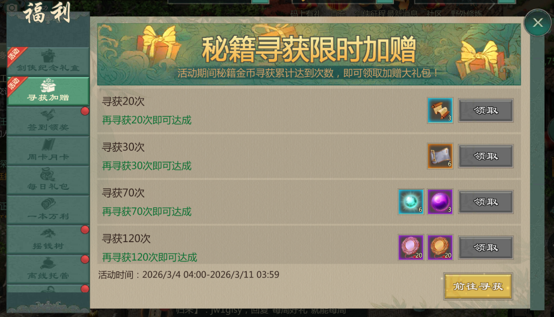 活动期间,各位大侠可从【福利】处打开【寻获加赠】活动界面,点击【前往寻获】即可跳转秘籍寻获界面并进行【金币寻获】,累计寻获一定次数即可领取额外的档位奖励,每个档位奖励仅限领取1次。
