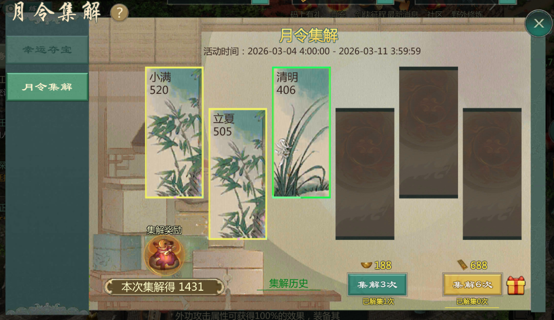 活动期间,翻开月令,以和作解,每次翻开月令获得点数,自由兑换多种奖励。消耗分数可兑换奖励。集六解累计达到次数,更有神品·秘籍残页稀有奖励等你来拿。