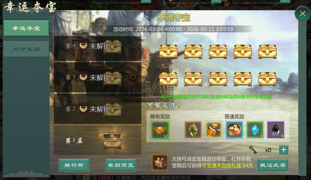*更多具体规则请在幸运夺宝界面了解,同时满足参与天下一帮赛事活动的大侠还可额外获得群雄令。