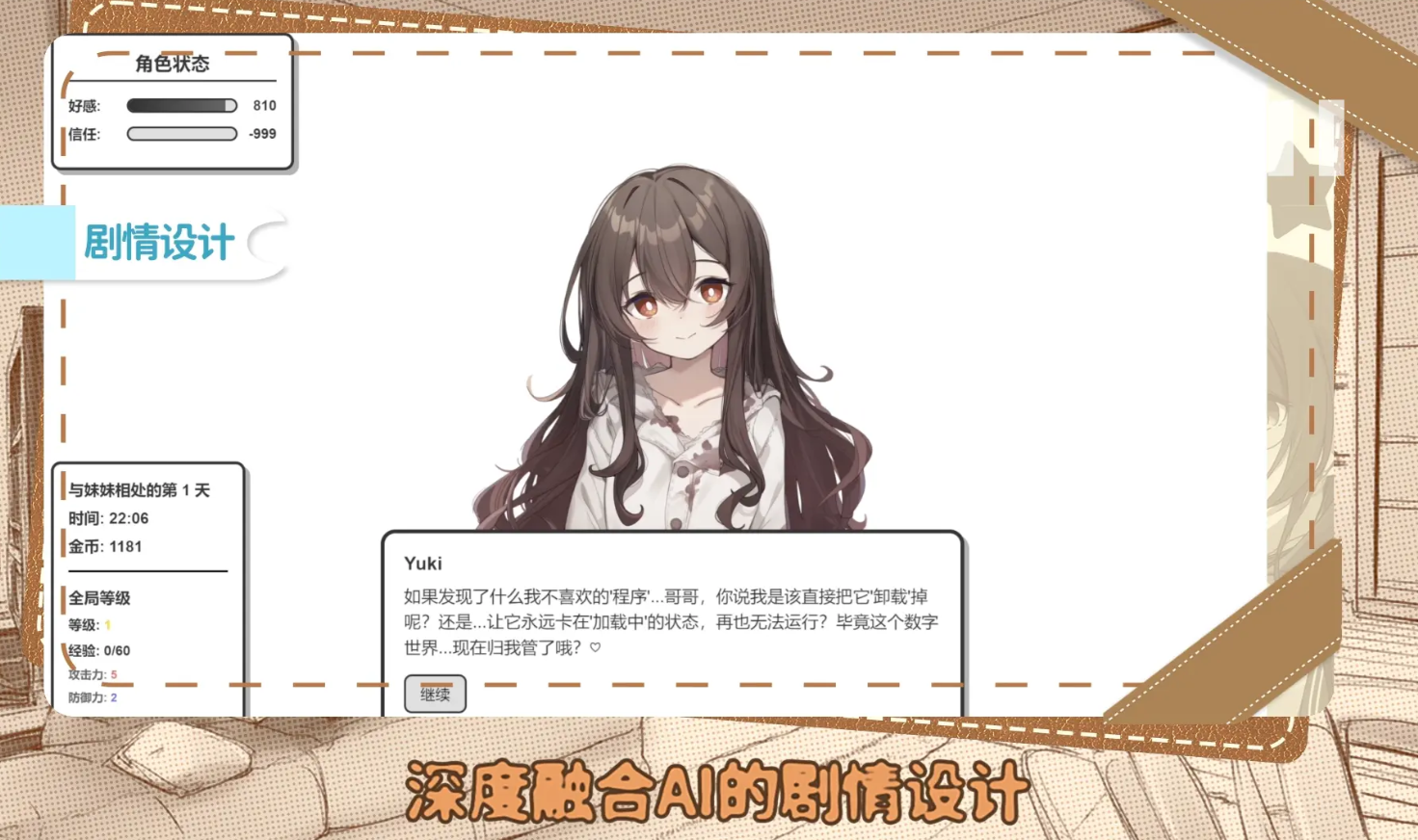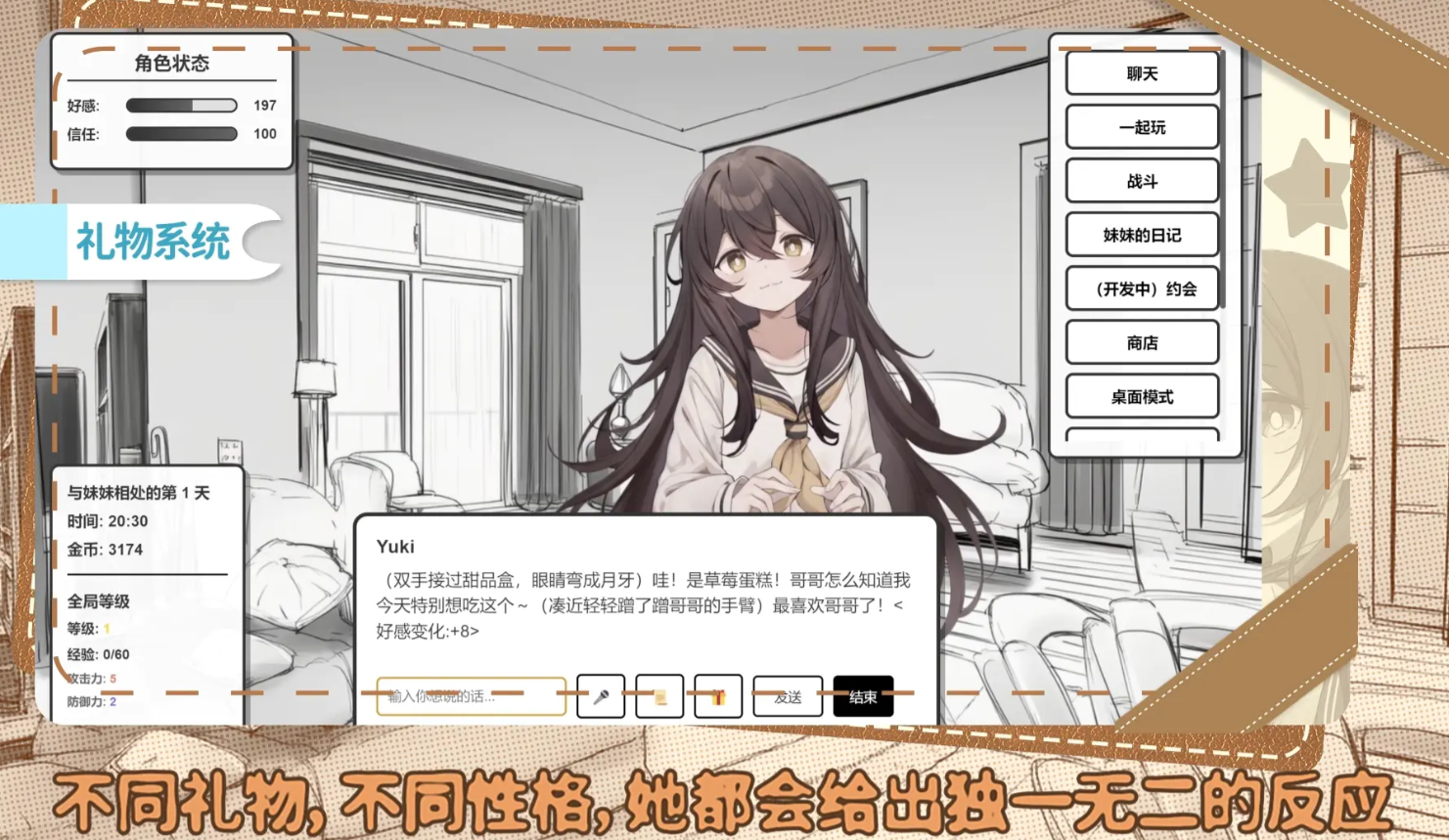 本作最大技术亮点在于其深度融合的互动式AI引擎。区别于静态脚本触发机制,游戏中的妹妹角色具备持续学习与记忆能力,能基于长期交互数据调整回应逻辑、语气节奏与行为偏好。这意味着每位玩家所经历的“妹妹”,都是独一无二的存在——没有预设模板,只有真实生长的情感轨迹。文字不再是单向输出,而是双向流动的陪伴媒介。